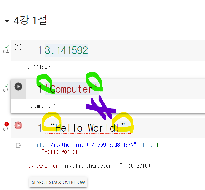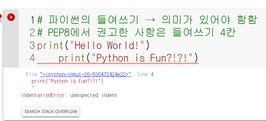 → 아래아한글이나 MS Word에서 복사해 붙인 코드는 파이썬 인터프리터가 인식하지 못하여 에러가 발생할 수 있으니 주의할 것