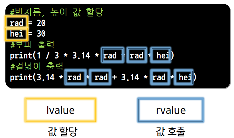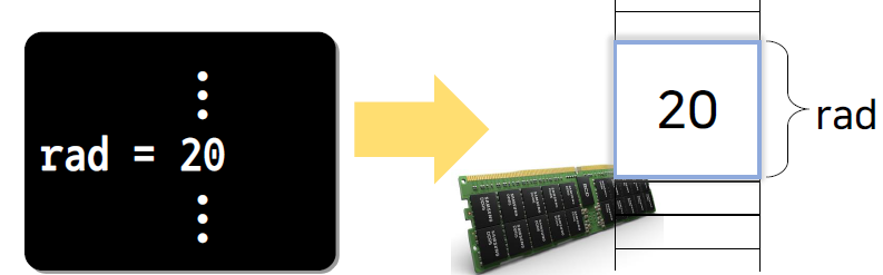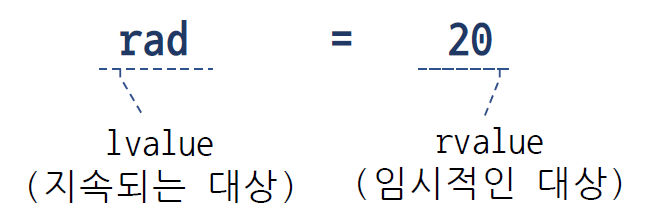 rad = 20 에서 '='는 할당연산자로, 오른쪽에 있는 값(20)을 왼쪽 변수(rad)에 집어 넣으라는 의미임.