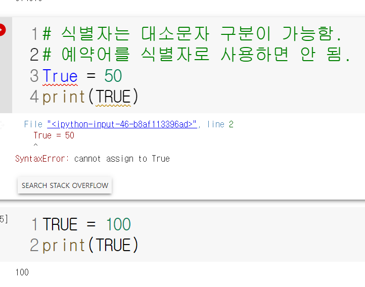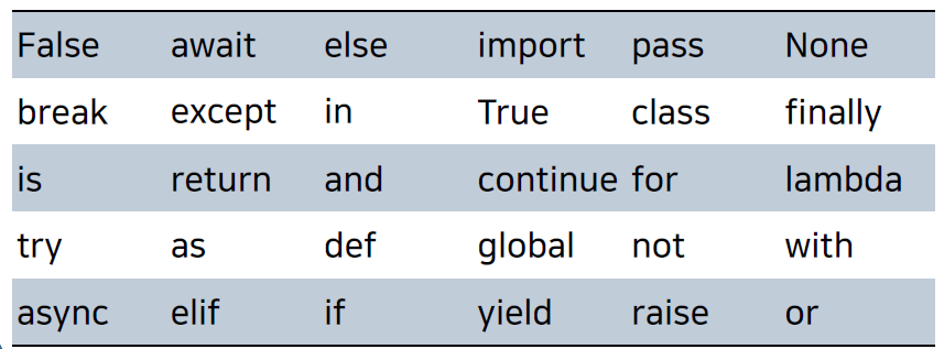 - 파이썬 인터프리터에 의해 이미 문법적인 용도로 사용되어 식별자로 사용이 불가능한 단어