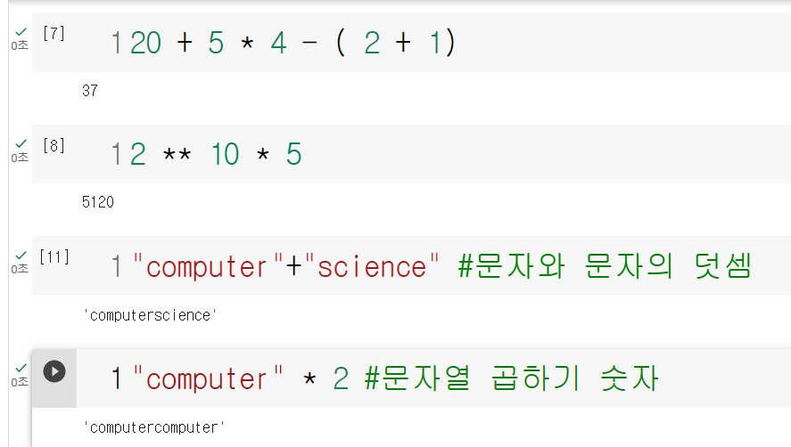 • 문자와 문자의 덧셈은 문자를 순서대로 붙여서 출력함.