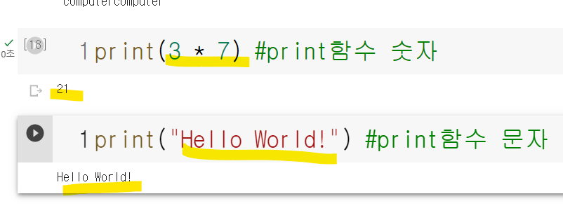 - Hello World라고 하는 문자열을 print함수에 넣어주는 것