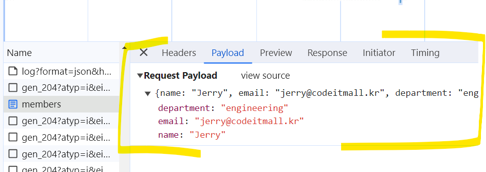 Request Payload라고 쓰인 부분이 바로 리퀘스트의 바디 부분