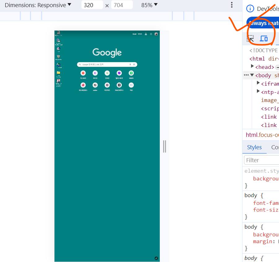 - 크롬 개발자도구에 접속하여 모바일 화면 확인