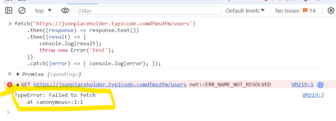 .catch((error) => { console.log('JS'); })