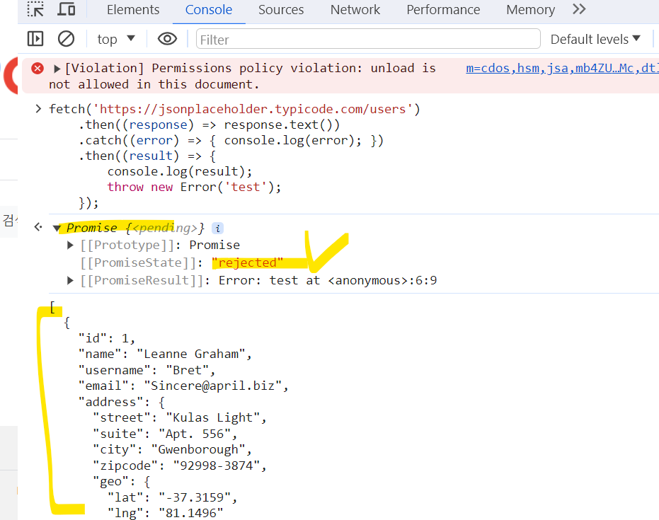 만약 promise 객체가 fulfilled 상태이면 그 결과가 response로 들어감. (작업 성공 결과)