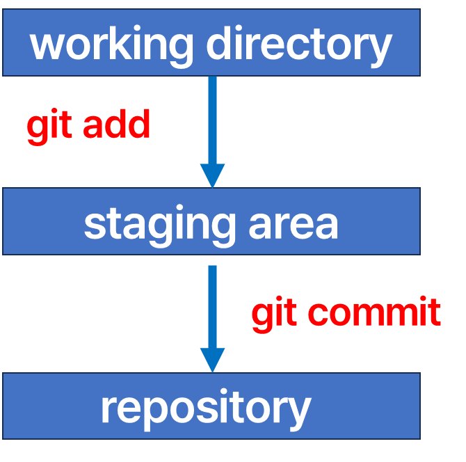 working directory [작업 영역] → git add → staging area [준비 영역] → git commit → repository [저장소] |
